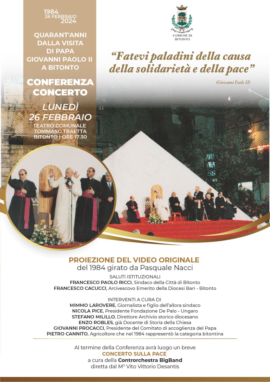 Il programma prevede la proiezione del video originale registrato quel giorno da Pasquale Nacci, noto in città per la sua pluriennale attività di documentazione video-fotografica amatoriale dei principali eventi religiosi cittadini, seguita da una conferenza, alla quale parteciperanno con il sindaco di Bitonto, Francesco Paolo Ricci, e l’arcivescovo emerito della Diocesi Bari-Bitonto, mons. Francesco Cacucci, Mimmo Larovere (giornalista e figlio dell’allora sindaco Girolamo Larovere), Nicola Pice (presidente della Fondazione “De Palo-Ungaro”), Stefano Milillo (direttore dell’Archivio Storico Diocesano), Enzo Robles (già docente di Storia della Chiesa all’Università di Foggia), Giovanni Procacci (presidente del Comitato di accoglienza del Papa) e Pietro Cannito (rappresentante degli agricoltori alla cerimonia del 1984).