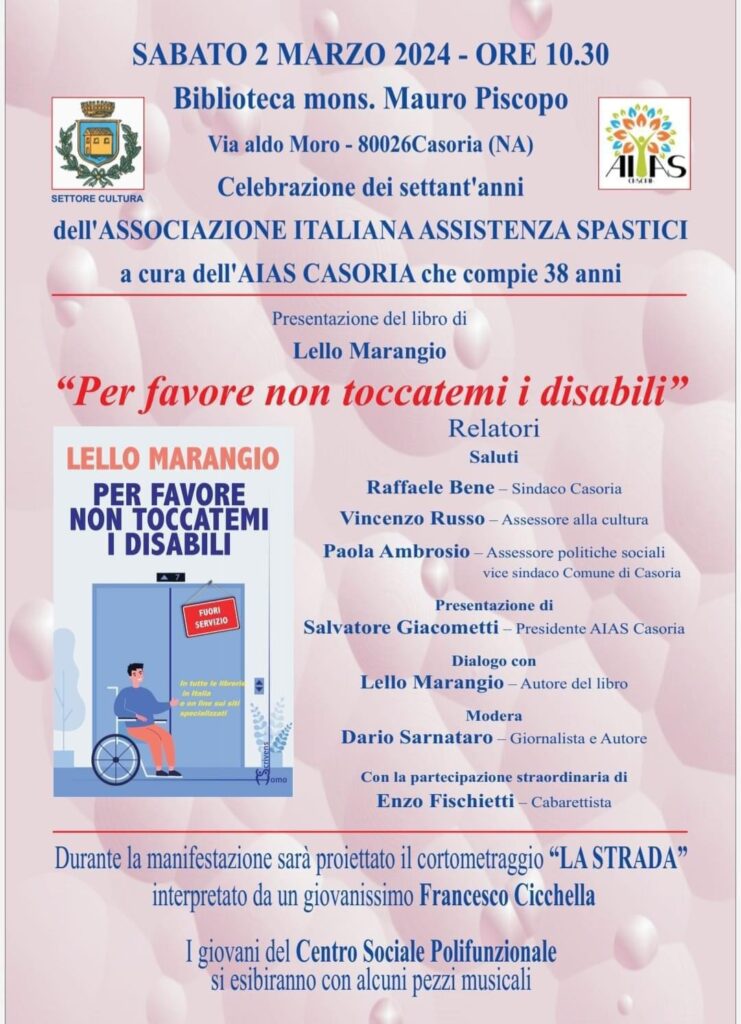 Si terrà sabato 2 marzo a Casoria la presentazione dell’ultimo volume di Lello Marangio “Per favore non toccatemi i disabili”, un libro manifesto perfettamente sospeso tra ironia e amare riflessioni sul mondo dei diversamente abili. L’appuntamento è per le 10.30, presso la Biblioteca “Mons. Mauro Piscopo” (via Aldo Moro 26): con lo scrittore, ma anche brillante autore teatrale e televisivo, Lello Marangio, ci sarà un testimonial d’eccezione, il comico e cabarettista Enzo Fischetti. L’incontro sarà moderato dal giornalista Dario Sarnataro e prevede la partecipazione, per i saluti istituzionali, del sindaco di Casoria Raffaele Bene, dell’assessore alla cultura Vincenzo Russo e dell’assessore alle politiche sociali Paola Ambrosio. Introdurrà il presidente dell’AIAS (Associazione Italiana Assistenza Spastici) sezione Casoria Salvatore Giacometti