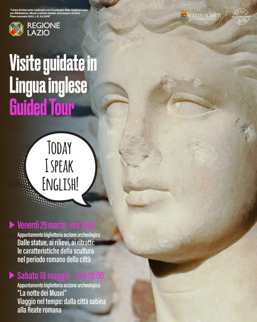 Il Museo Civico di Rieti, grazie ai fondi messi a disposizione dalla Regione Lazio per il finanziamento dei Musei ed Istituti similari, organizza un ciclo di visite destinate al pubblico non di lingua italiana, per la valorizzazione del patrimonio custodito nelle proprie sale e per approfondire alcune tematiche. Gli appuntamenti sono in calendario per venerdì 29 marzo, sabato 18 maggio, sabato 31 agosto e venerdì 4 ottobre.
