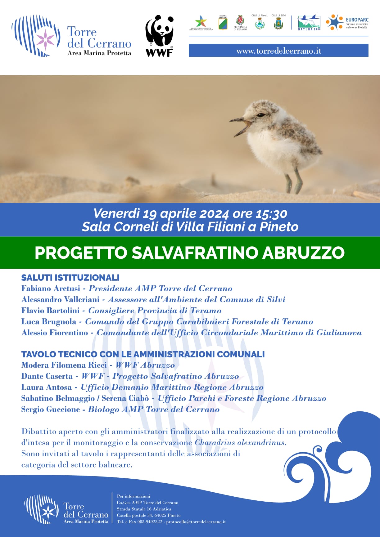 PINETO. Anche quest’anno con l’avvicinarsi della stagione riproduttiva del Fratino, riparte il Progetto che da anni tutela questa specie: il Salvafratino Abruzzo, promosso dall’Area Marina Protetta Torre del Cerrano e dal WWF, con il supporto della Guardia Costiera. Il 19 aprile 2024 alle 15,30 nella Sala Corneli di Villa Filiani a Pineto, si terrà un convegno alla presenza di esperti per parlare del Progetto e per realizzare un protocollo d’intesa con le amministrazioni per il monitoraggio e la conservazione di questo piccolo trampoliere.