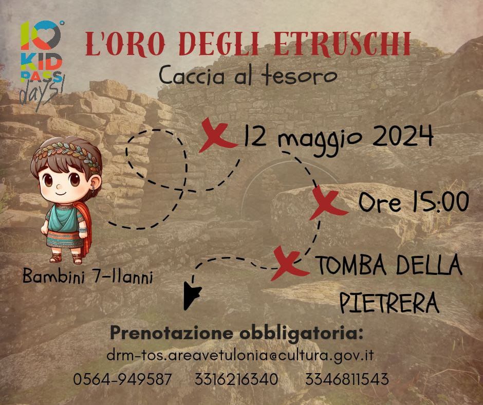 Nel pomeriggio, alle 15:00, la caccia al tesoro si sposta a Vetulonia. I bambini dai 7 agli 11 anni potranno cercare “L’oro degli Etruschi” presso la Tomba della Pietrera.