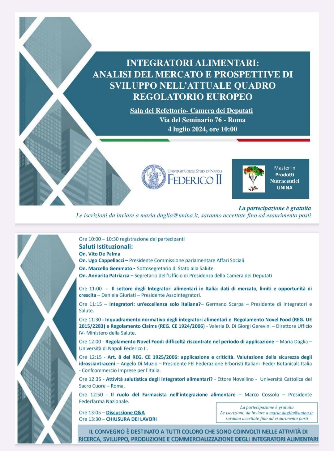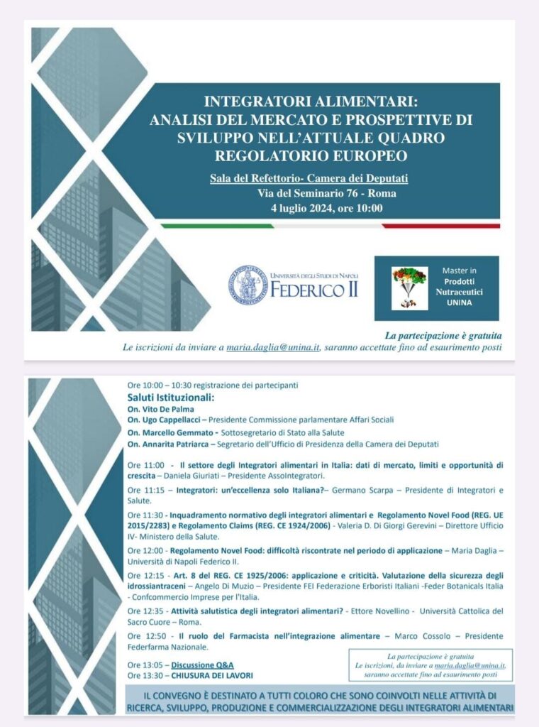 Alle 10.30 nella Sala del Refettorio di Palazzo San Macuto il convegno “Integratori alimentari: analisi del mercato e prospettive di sviluppo nell’attuale quadro regolatorio europeo”. Interviene la Segretaria di presidenza Annarita Patriarca Diretta web qui: https://webtv.camera.it/evento/25754