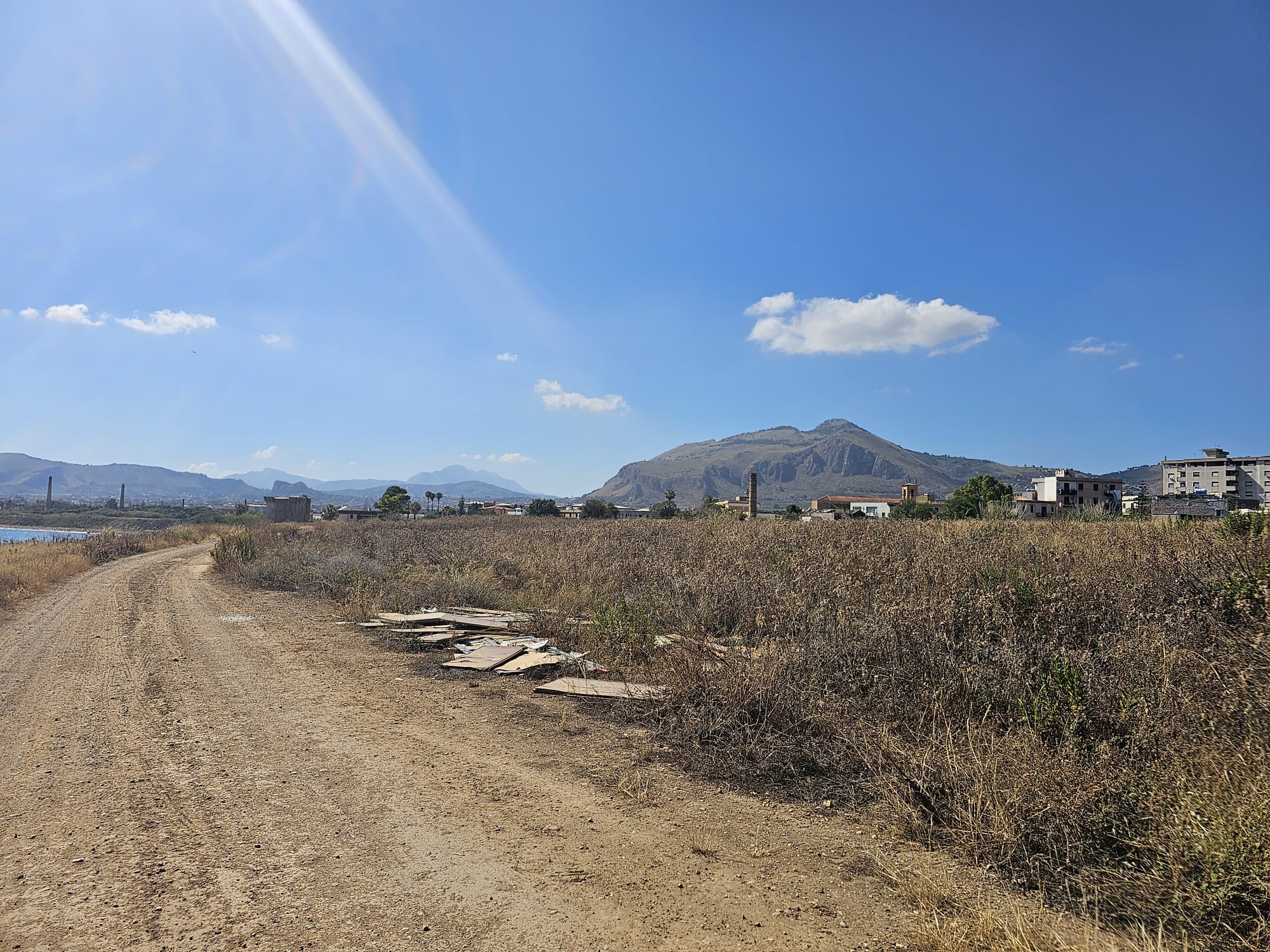 una distesa di erba secca contornata da piccole e grandi discariche a cielo
