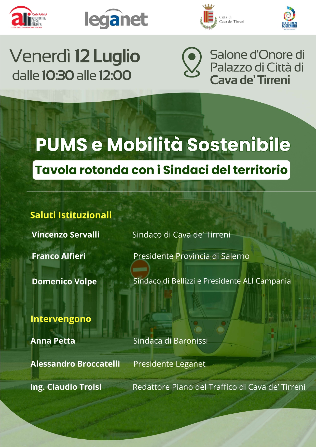 Tavola rotonda con i Sindaco del territorio sulla Mobilità Sostenibile e PUMS (Piani Urbani Mobilità Sostenibili), organizzata dall’Amministrazione Servalli e da Ali Campania e Leganet, venerdì 12 luglio, con inizio alle ore 10.30, presso il Salone d’Onore di Palazzo di Città.