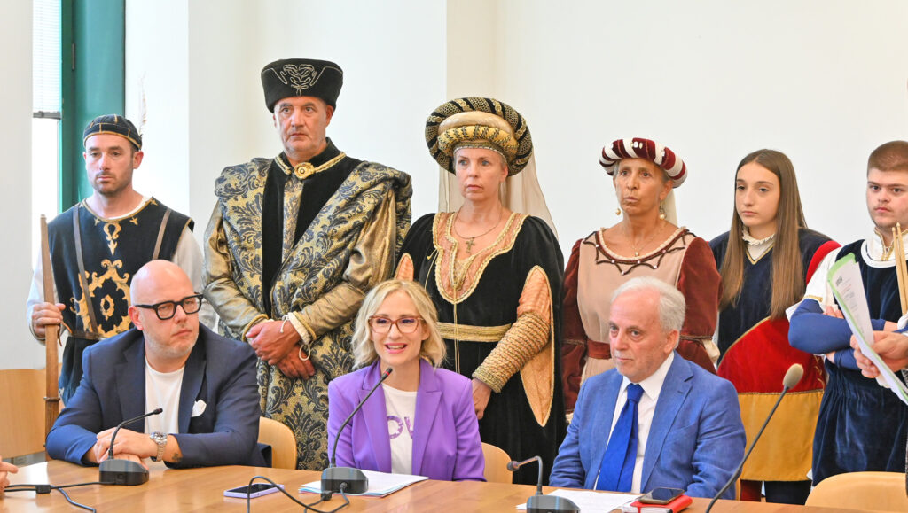 E’ stata presentata in regione l’edizione 2024 delle Feste Medievali di Offagna. A fare gli onori di casa l’assessore alla cultura, spettacolo ed eventi Chiara Biondi. Presenti il sindaco di Offagna Ezio Capitani, il presidente del Comitato feste Matteo Brignoccoli e il direttore artistico Alessandro Martello, accompagnati da una rappresentativa di figuranti e tamburini.
