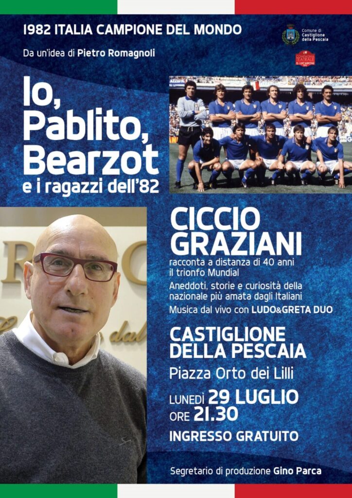 L’appuntamento è lunedì 29 luglio alle 21:30 in Piazza Orto del Lilli a Castiglione della Pescaia per rivivere la magia della vittoria dell’Italia ai Mondiali di Spagna del 1982 in compagnia di chi quella magia l’ha vissuta, il campione del mondo Ciccio Graziani.