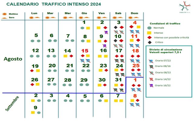 Al fine di fornire ai cittadini informazioni utili per favorire partenze consapevoli e per aumentarne la sicurezza, Viabilità Italia, che monitorerà costantemente le condizioni di percorribilità della rete viaria di interesse nazionale, ha messo a disposizione documenti consultabili sul sito internet http://www.poliziadistato.it, tra cui il calendario con i bollini di traffico con indicazione delle fasce orarie di divieto di circolazione per i veicoli di portata superiore alle 7.5 t. e il “Piano Estate 2024” .