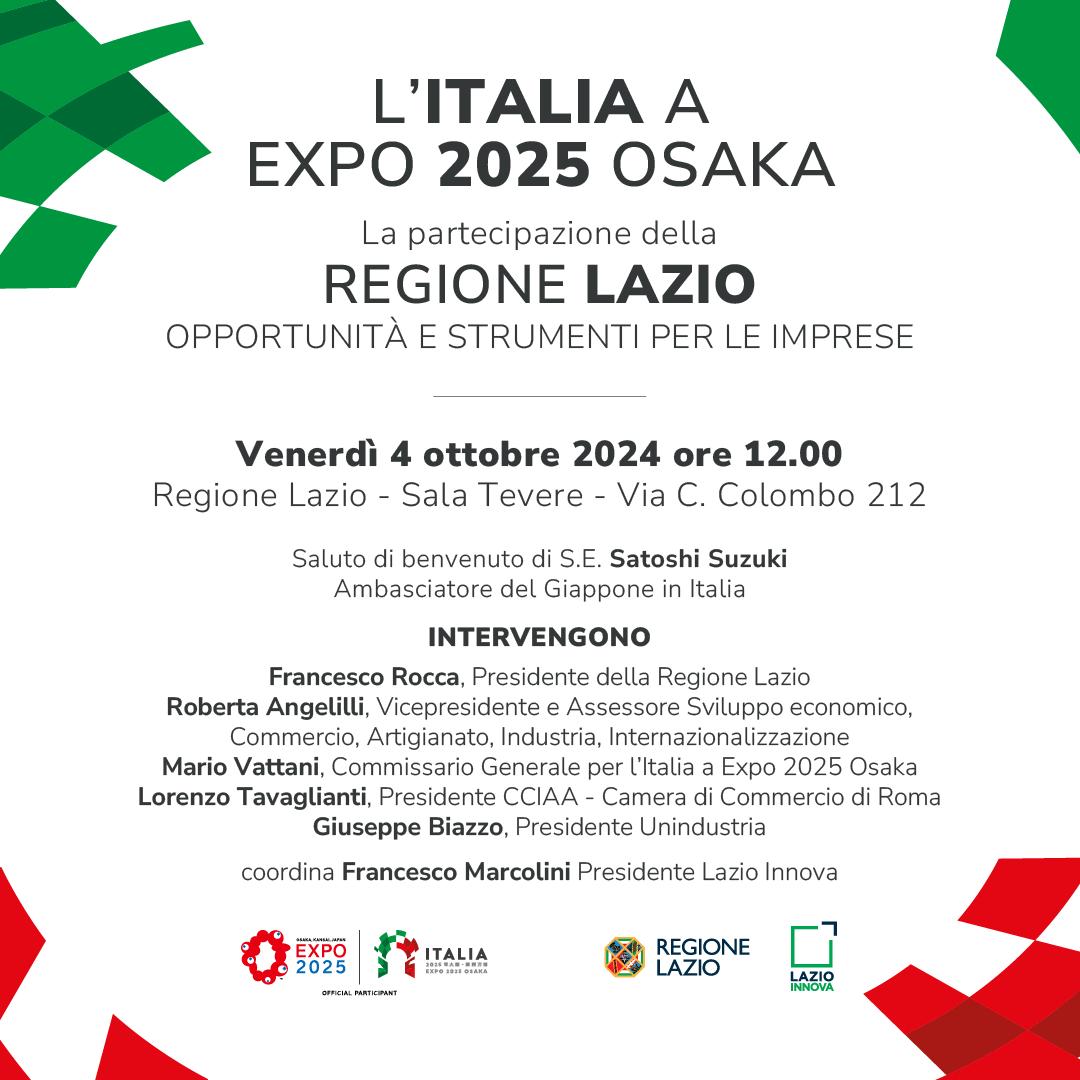 Alla conferenza stampa interverranno il presidente della Regione Lazio, Francesco Rocca; il commissario generale per l’Italia a Expo Osaka 2025, Mario Vattani; il presidente della Camera di Commercio di Roma, Lorenzo Tagliavanti; il presidente di Unindustria, Giuseppe Biazzo; il presidente di Lazio Innova, Francesco Marcolini.