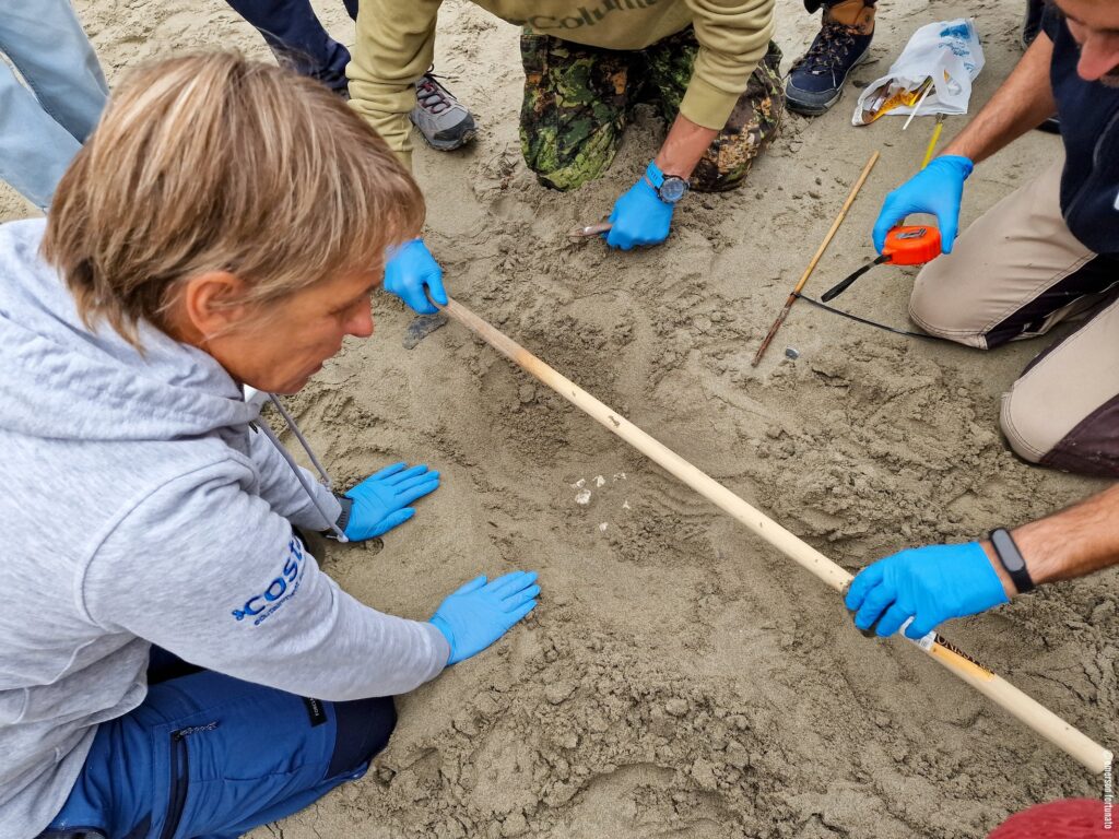 Nella camera del nido, posta a circa 25 cm di profondità nella sabbia (profondità alterata dalle mareggiate), sono state rinvenute 82 uova a cui si aggiungono le 4 portate in superficie a seguito delle mareggiate, per un totale di 86 uova.