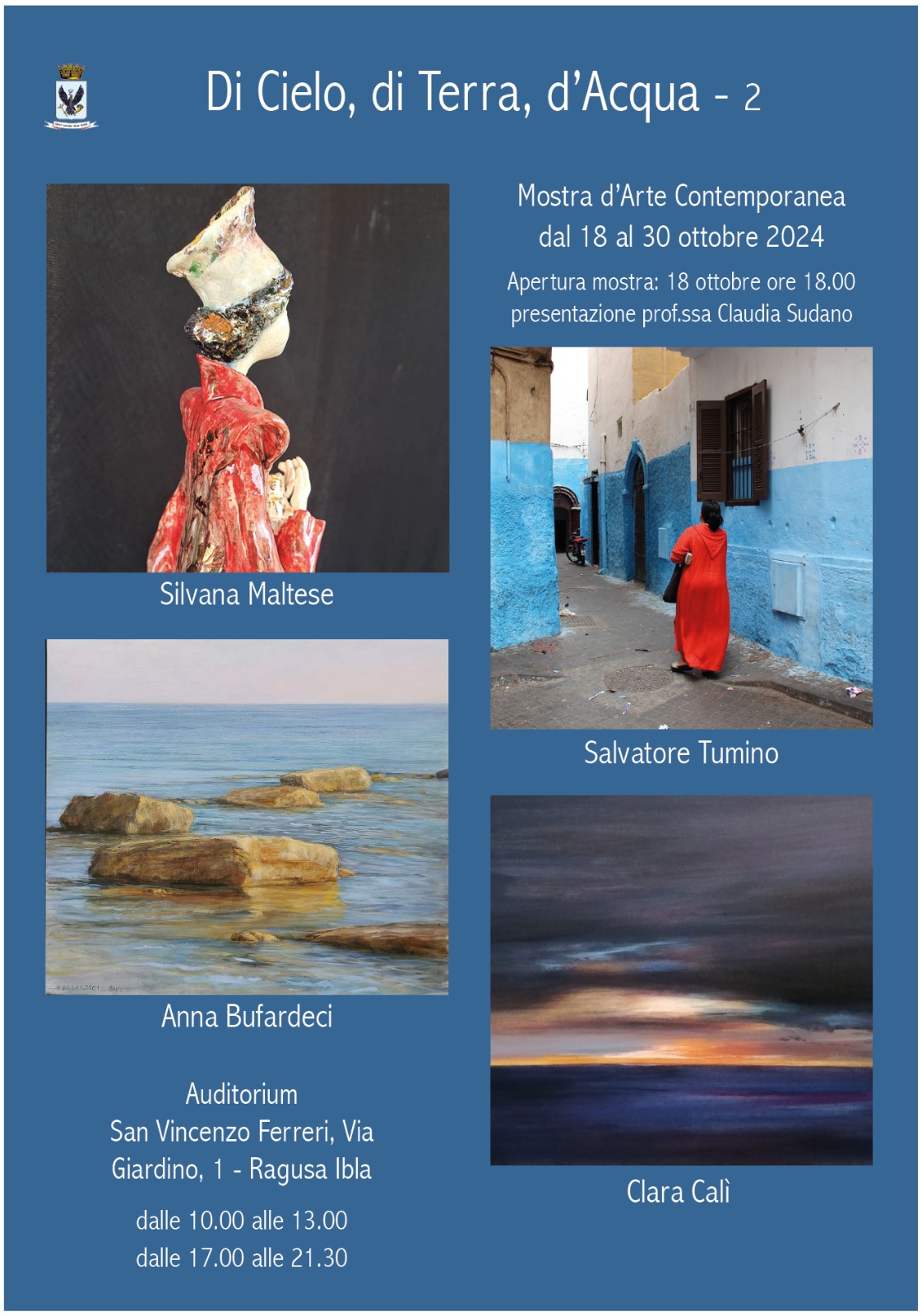 All’Auditorium San Vincenzo Ferreri a Ragusa Ibla sarà invece inaugurata, alle ore 18 la mostra collettiva “Di cielo di terra e d’acqua” che sarà visitabile fino al 30 ottobre 2024. L’esposizione vedrà la partecipazione degli artisti Silvana Maltese, Clara Calì, Anna Bufardeci e Salvatore Tumino, che presenteranno le loro opere ispirate ai temi della natura e degli elementi. La mostra sarà aperta al pubblico tutti i giorni dalle 10 alle 13 e dalle 17 alle 21.30.