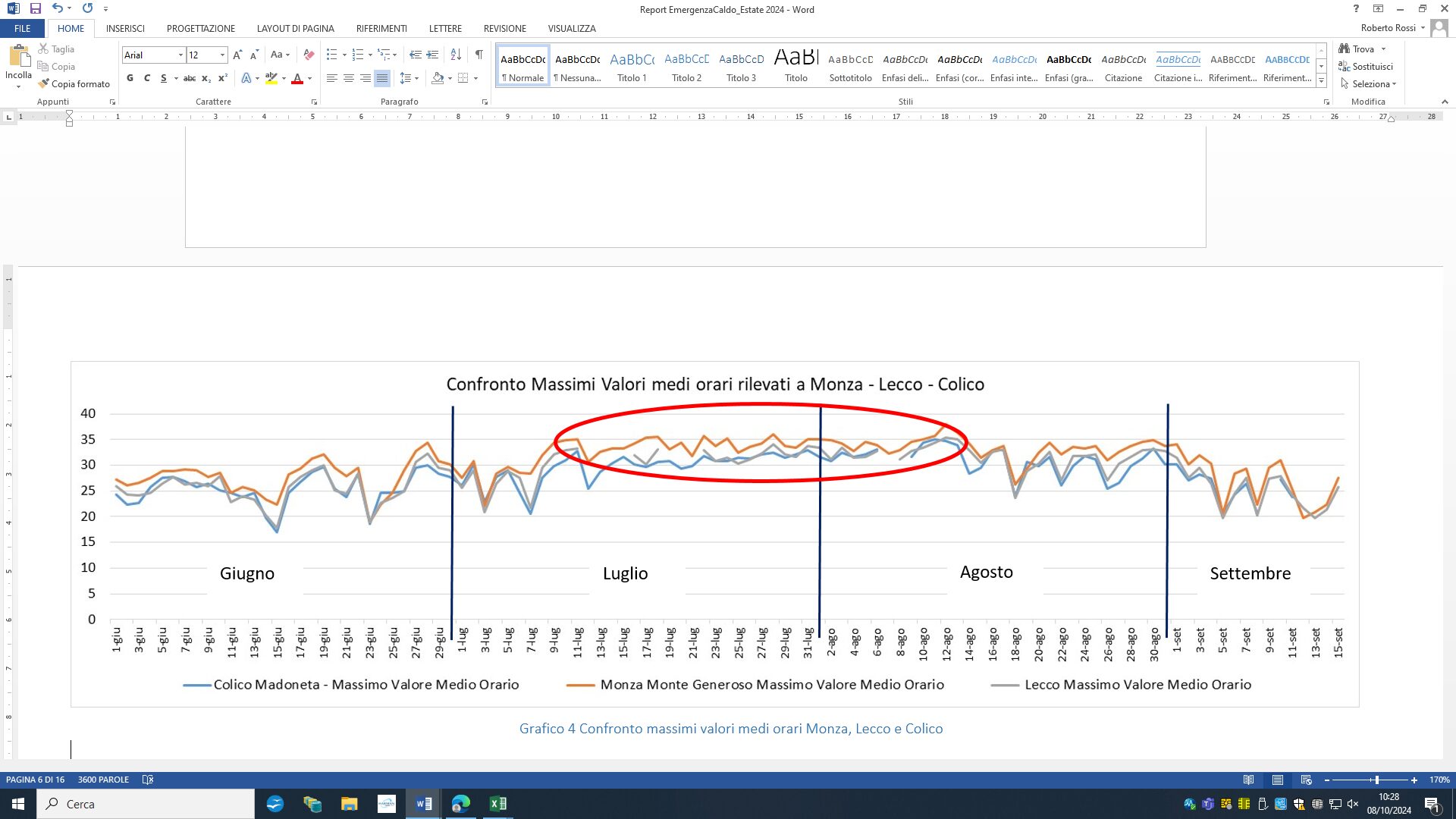 Il grafico sottostante mostra come, nel territorio di ATS Brianza, il periodo estivo sia iniziato in modo abbastanza mite, per poi divenire sempre più caldo e non confortevole. Salvo qualche eccezione, il periodo compreso tra il 01/06/24 e il 07/07/24 è stato caratterizzato da temperature massime orarie che, fatta salva qualche occasione, non hanno superato la soglia dei 30° e frequentemente si sono registrati valori compresi tra i 20 e 25 gradi. Il periodo successivo, dal 08/07/24 al 13/08/24, è stato invece caratterizzato da temperature massime che si collocano in genere al di sopra dei 30°C nelle tre aree territoriali di ATS esaminate: nord (Colico), centro (Lecco) e sud (Monza). Il periodo successivo, dal 14/08/24 al 15/09/24, invece si caratterizza per una progressione discendente verso temperature più basse.