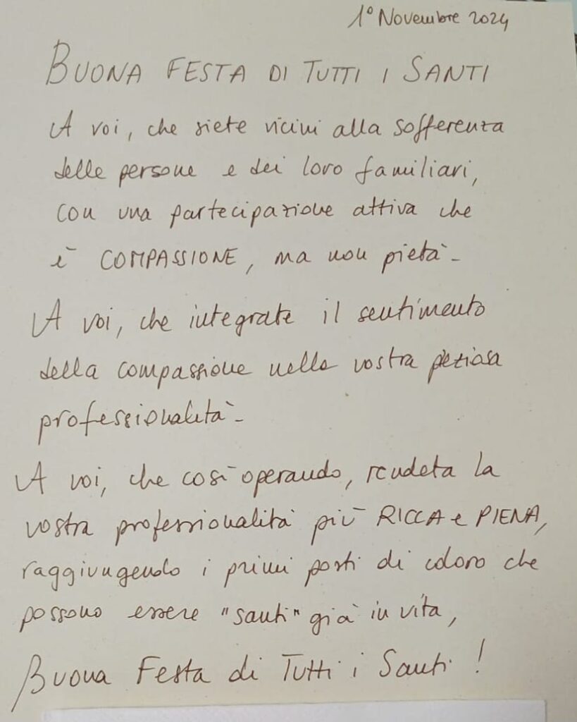 Tale è stato il coinvolgimento emotivo del personale che la famiglia della paziente per il 1° novembre ha scritto una lettera agli operatori dell’Hospice: “ A voi che siete vicini alla sofferenza delle persone e dei loro familiari, con una partecipazione attiva che è compassione nella vostra preziosa professionalità. A voi che, così operando, rendete la vostra professionalità più ricca e piena, raggiungendo i primi posti di coloro che possono essere “santi” già in vita, Buona festa di Tutti i Santi ”.