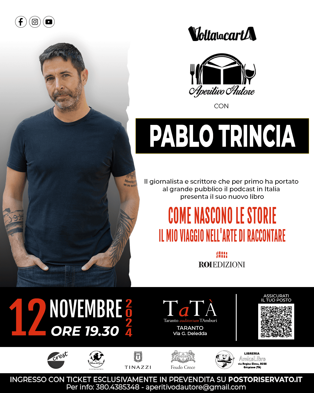 Il 12 novembre Aperitivo d’Autore ospiterà Pablo Trincia, uno dei narratori più