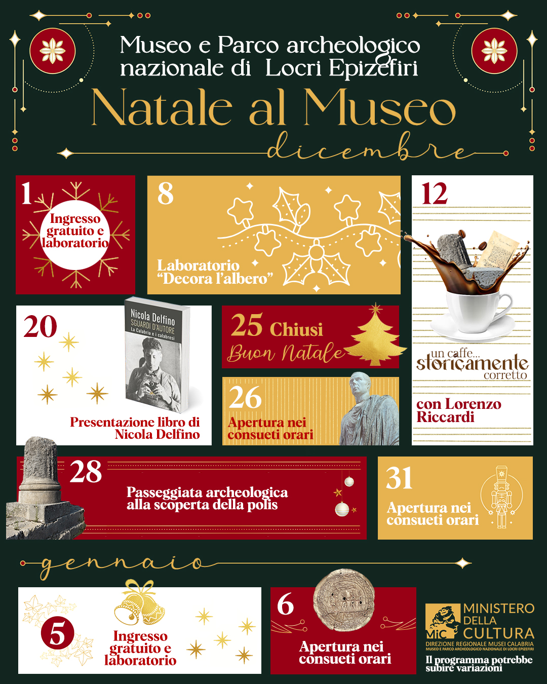 Sarà un dicembre intenso quello promosso dalla direzione del Parco archeologico nazionale di Locri Epizefiri che offrirà un ricco calendario di appuntamenti, pensati per abbracciare diversi target di pubblico.