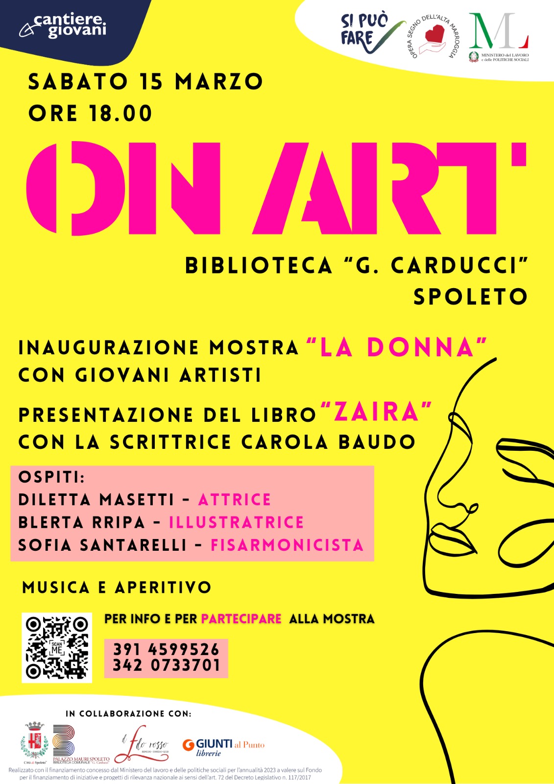 Prenderà il via sabato 15 marzo alla biblioteca comunale “G. Carducci” alle ore 18.00 il Progetto “ON ART” con l’inaugurazione di una mostra di giovani artiste ed artisti, all’interno del progetto “Si può fare”, in collaborazione con l’Associazione IL FILO ROSSO e con il Comune di Spoleto, facente parte del palinsesto comunale per la Giornata Internazionale della Donna.