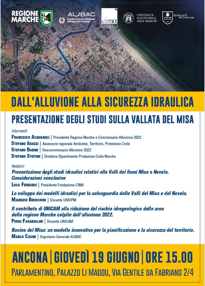 (AGENPARL) - Roma, 18 Giugno 2025 - Domani giovedì 19 giugno alle ore 15 a Palazzo Li Madou (Parlamentino 5° piano) saranno presentati gli studi sulla Vallata del Misa “Dall’alluvione alla sicurezza idraulica” realizzati dalla Fondazione CIMA (Centro Internazionale in Monitoraggio Ambientale) , da UNIVPM (Politecnica delle Marche) e da UNICAM (Università di Camerino) coordinate da AUBAC (Autorità di Bacino Distrettuale dell’Appennino Centrale). In particolare verranno illustrati i risultati dei modelli idraulici, tarati sulla base delle opere idrauliche realizzate e di quelle programmate, di importanza fondamentale per ridurre il rischio idraulico delle aree colpite dall’alluvione del 2022 ed ottimizzare le previsioni del PAI.