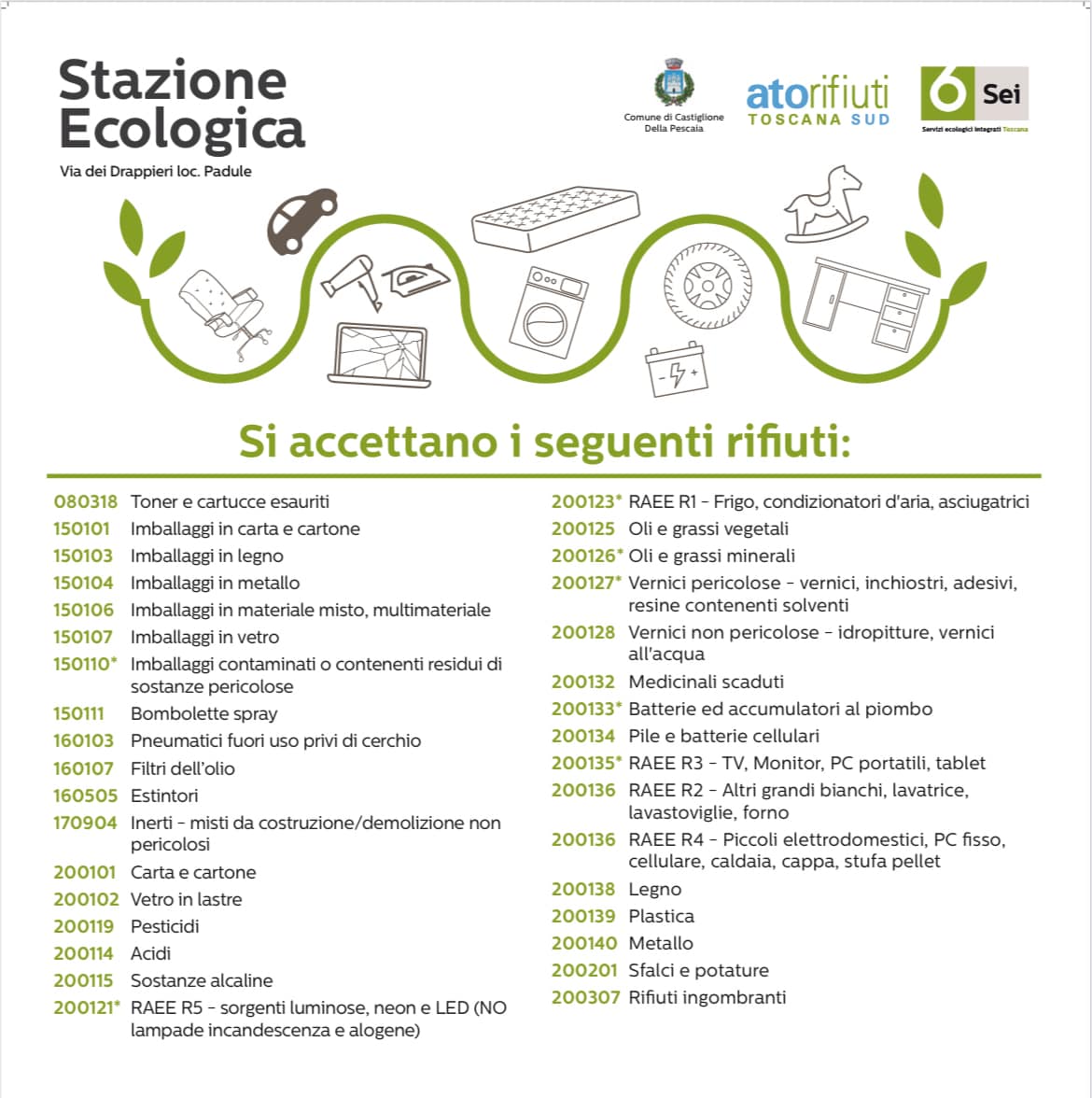 A partire da lunedì 7 luglio sarà possibile conferire tutte le tipologie di rifiuto, oltre 30, tra cui rifiuti elettrici (lampadine, neon), rifiuti elettronici (RAEE) e rifiuti urbani pericolosi (RUP) come pile e batterie.