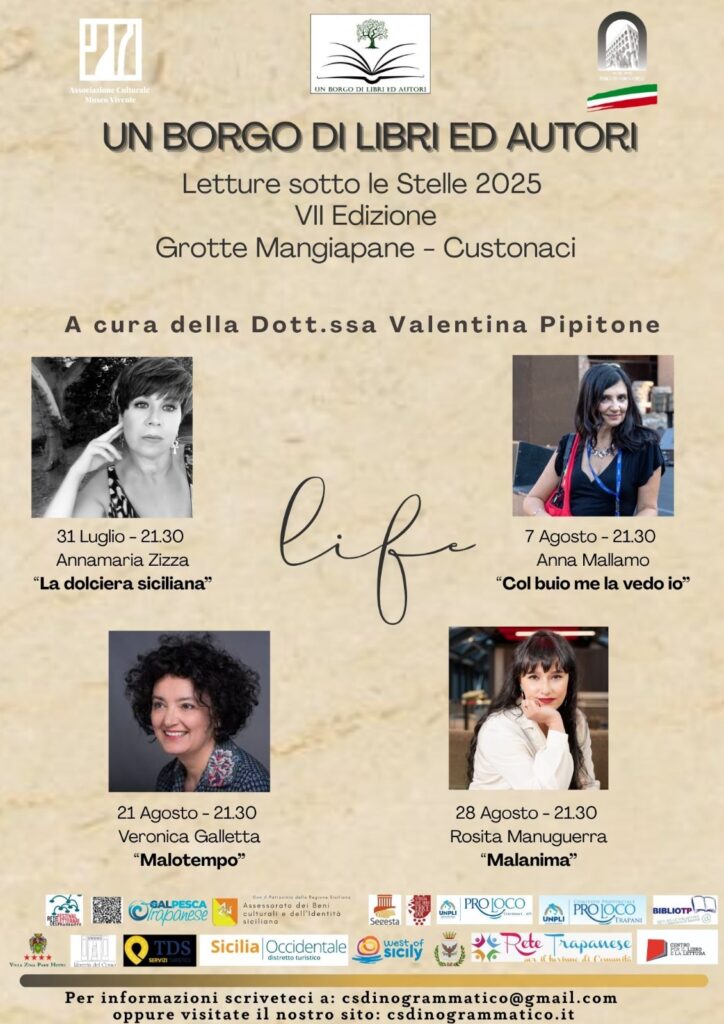 CUSTONACI (TP) – Torna anche per l’estate 2025 l’attesa rassegna “Un Borgo di Libri ed Autori – Letture sotto le Stelle”, giunta alla sua settima edizione. Un evento ormai divenuto tappa obbligata per appassionati lettori, turisti e amanti della cultura, che si svolgerà come da tradizione nella suggestiva cornice delle Grotte Mangiapane di Custonaci, uno dei luoghi più affascinanti della Sicilia occidentale.
