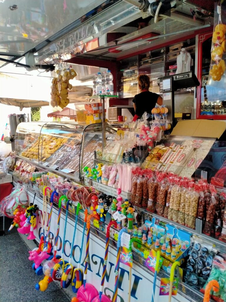 coloratissimi banchi di giocattoli e dolciumi, tra cui spicca la tipica corona di San Bartolomeo, una
