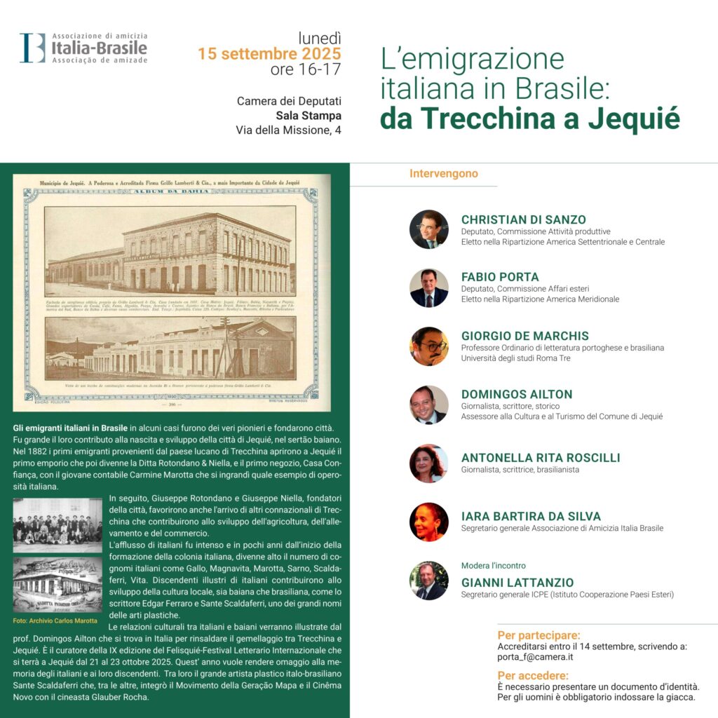 Le relazioni culturali tra italiani e brasiliani alla luce dell’emigrazione italiana nello Stato di Bahia – in particolare nella città di Jequié – saranno al centro della conferenza stampa che si terrà lunedì 15 settembre 2025, alle ore 16.00, a Roma, presso la Sala Stampa della Camera dei Deputati.