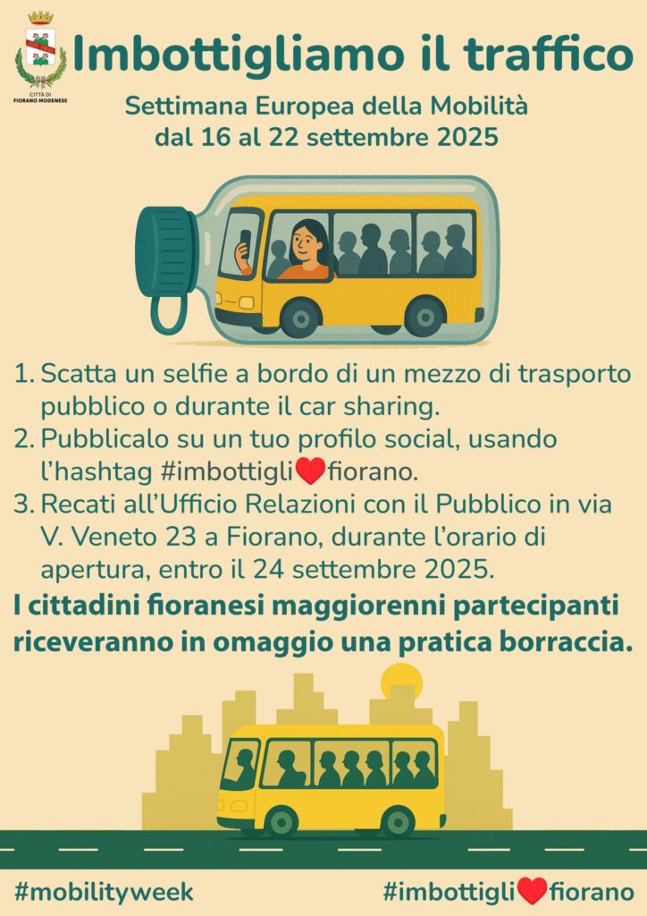 Per l’occasione, l’Amministrazione comunale ha deciso di promuovere il progetto “Imbottigliamo il traffico”, rivolto a tutti i cittadini maggiorenni di Fiorano Modenese che sceglieranno mezzi di trasporto alternativi all’automobile, come autobus, treni o car sharing.