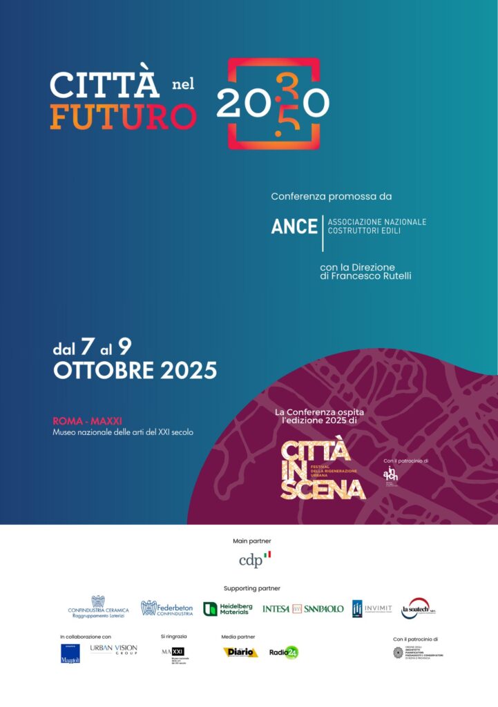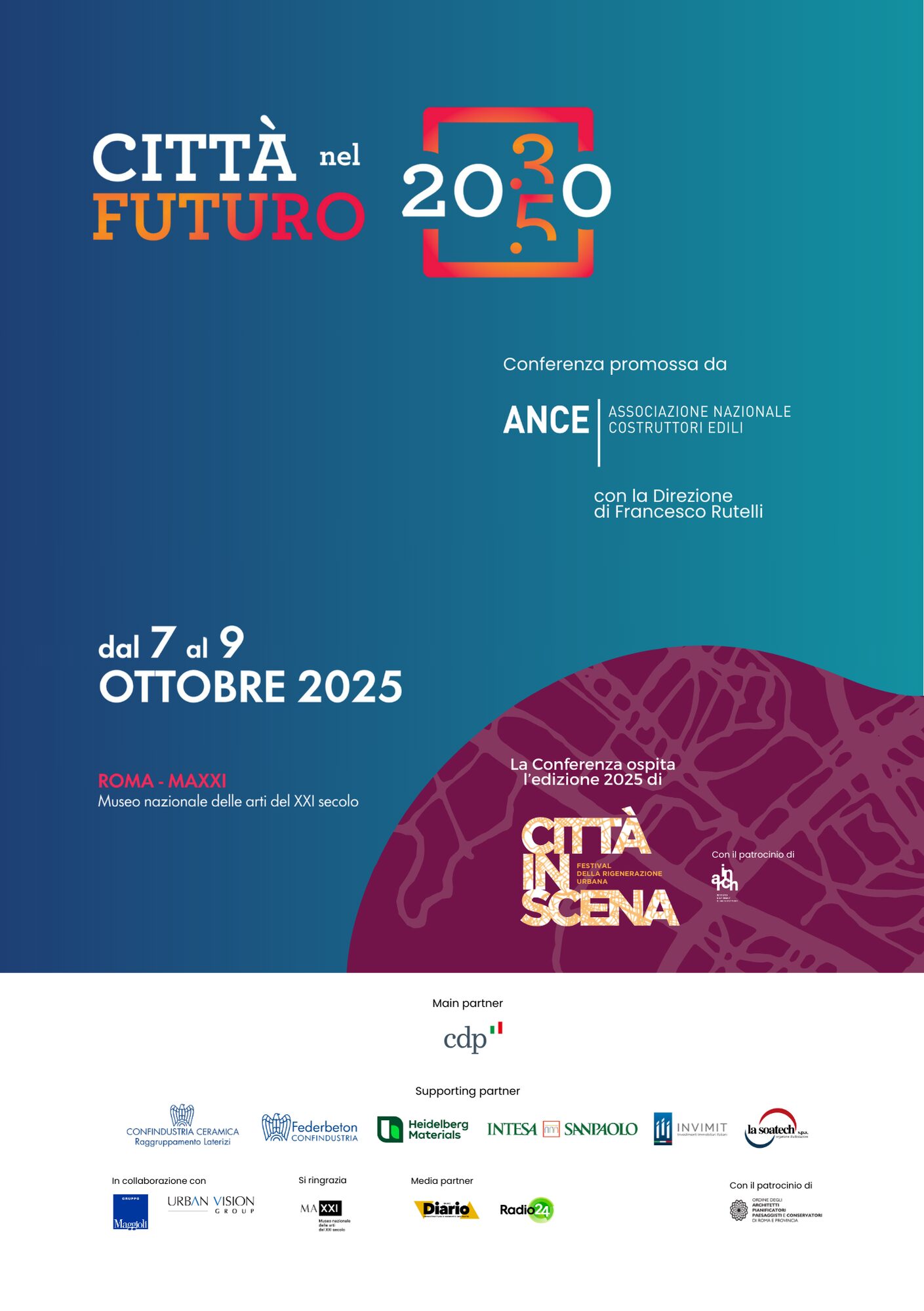 si terrà a Roma, dal 7 al 9 ottobre presso il MAXXI, la Conferenza “Città nel Futuro 2030-2050”, promossa da Ance con la direzione di Francesco Rutelli. Tre giornate di incontri, dibattiti e confronti, con i più importanti esponenti delle istituzioni italiane e europee, le migliori esperienze internazionali, le realtà imprenditoriali, associative e professionali, sui temi della rigenerazione urbana, della casa accessibile, dell’adattamento climatico e del governo delle acque: urgenze che richiedono misure tempestive per garantire una crescita realmente sostenibile delle città.