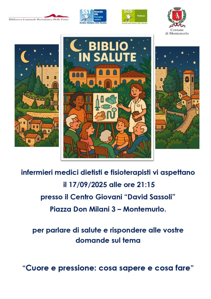 A Montemurlo “Biblio in salute” è la rassegna, promossa dal Comune con l’Usl Toscana Centro e la Società della Salute Area Pratese, per essere informati e consapevoli sulle buone pratiche per controllare il proprio stato di salute e per rimanere in forma. Il nuovo incontro con infermieri, medici dietisti e fisioterapisti della Usl Toscana Centro è per domani, mercoledì 17 settembre ore 21,15 al Centro Giovani “David Sassoli” (piazza Don Milani 3 – Montemurlo) sul tema “Cuore e pressione: cosa sapere e cosa fare”. I professionisti presenti saranno pronti a rispondere a domande e curiosità. All’incontro partecipano l’assessore alla cultura, Giuseppe Forastiero e alle politiche sociali, Alberto Fanti. L’ingresso è libero e gratuito.