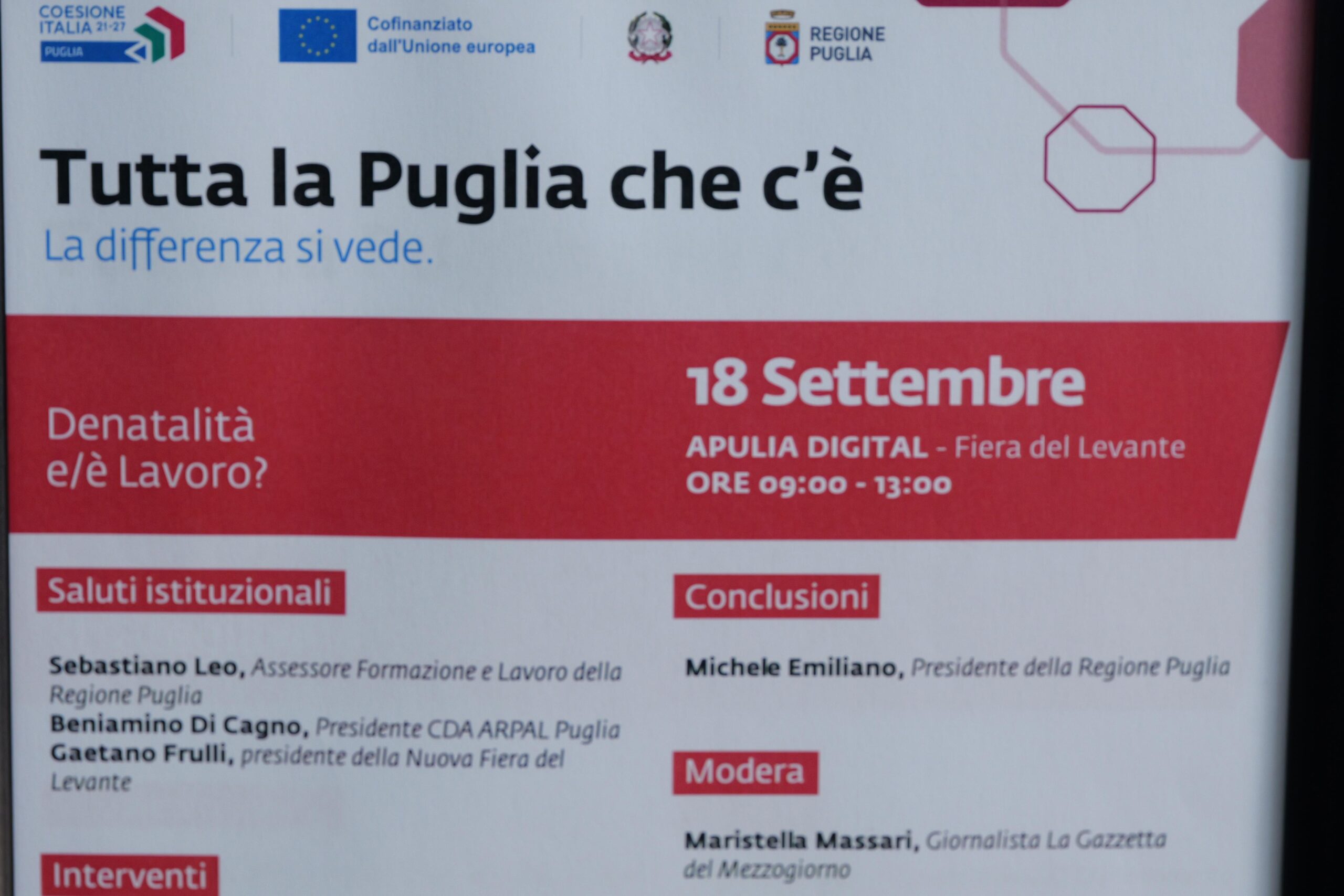 Se n’è discusso oggi in un incontro svoltosi nell’auditorium Digital Lab – Fiera del Levante dal titolo “Denatalità e/è Lavoro?” organizzato dall’Agenzia Regionale per le Politiche Attive della Regione Puglia – ARPAL Puglia. Durante l’incontro, moderato dalla giornalista Maristella Massari, è stata analizzata la relazione tra denatalità e lavoro, con particolare attenzione ai temi dell’occupazione femminile, della conciliazione tra vita privata e vita lavorativa e dell’immigrazione come questioni fondamentali per lo sviluppo del Paese. E che riguardano il ruolo delle istituzioni locali poiché la diminuzione della popolazione e gli squilibri generazionali sono più marcati nelle aree più deboli del paese come il Mezzogiorno e le Aree interne.