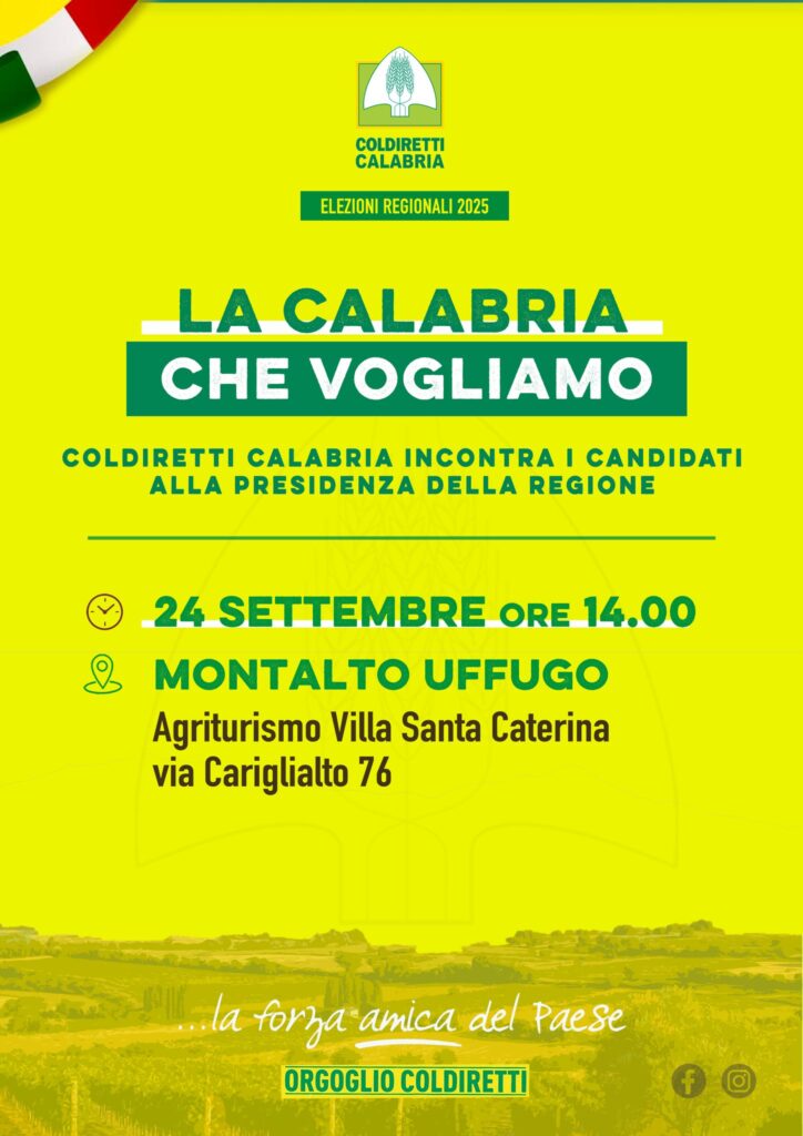 Coldiretti Calabria organizza un incontro con i candidati alla presidenza della Regione Calabria, in programma mercoledì 24 settembre p.v. dalle ore 14:00 presso l’Agriturismo Villa Santa Caterina di Montalto Uffugo (CS). L’iniziativa, dal nome: “La Calabria che vogliamo”, sarà un momento di confronto aperto e trasparente per mettere al centro dell’agenda politica le priorità dell’agricoltura e dell’agroalimentare regionale e del mondo rurale.