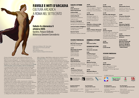 Sabato 4 e domenica 5 ottobre la Fondazione Marignoli di Montecorona, insieme alla Fondazione Federico Zeri dell’Università di Bologna – e in questa occasione con la collaborazione della Fondazione Camillo Caetani di Roma – propone un convegno sul tema “Favole e Miti d’Arcadia. Cultura arcadica a Roma nel Settecento”.