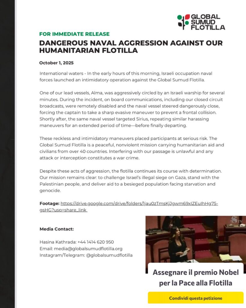 Acque internazionali – Nelle prime ore di questa mattina, le forze navali dell’occupazione israeliana hanno lanciato un’operazione intimidatoria contro la Flotilla Global Sumud. Una delle nostre navi di punta, Alma, è stata aggirata aggressivamente da una nave da guerra israeliana per diversi minuti. Durante l’incidente, le comunicazioni a bordo, inclusi i nostri servizi di trasmissione a circuito chiuso, sono state disabilitate a distanza e la nave da guerra si è avvicinata pericolosamente, costringendo il capitano a effettuare una brusca manovra evasiva per evitare una collisione frontale. Poco dopo, la stessa nave da guerra ha preso di mira Sirius, ripetendo manovre di molestia simili per un periodo di tempo prolungato prima di allontanarsi definitivamente.Queste manovre sconsiderate e intimidatorie hanno posto i partecipanti a serio rischio. La Flotilla Global Sumud è una missione pacifica e non violenta che trasporta aiuti umanitari e civili provenienti da oltre 40 paesi. Interferire con il nostro passaggio è illegale e qualsiasi attacco o intercettazione costituisce un crimine di guerra.Nonostante questi atti di aggressione, la flotilla continua il suo percorso con determinazione. La nostra missione rimane chiara: sfidare l’assedio illegale di Israele su Gaza, stare al fianco del popolo palestinese e fornire aiuti a una popolazione assediata che affronta fame e genocidio.