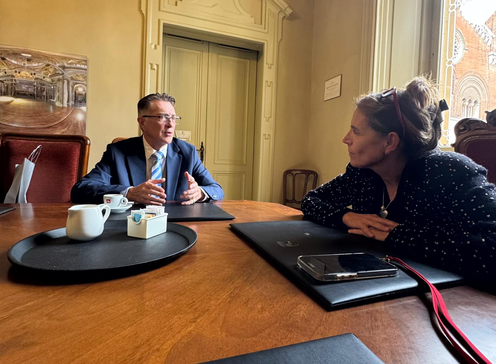 Dopo la visita in Comune, il console ha avuto l’occasione di ammirare il Teatro Municipale di Piacenza, accompagnato da Cristina Ferrari, direttrice della Fondazione Teatri, che ne ha illustrato la storia.
