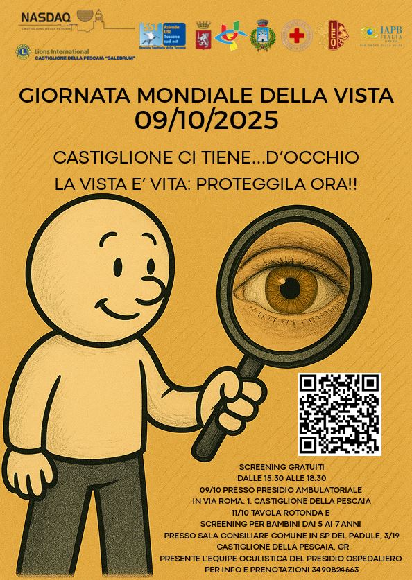 Il pomeriggio di sabato 11 ottobre sarà invece dedicato ai più piccoli, con l’equipe oculistica ospedaliera del percorso pediatrico che, presso la sala Consiliare del Comune di Castiglione della Pescaia alle 15:30, terrà una tavola rotonda per approfondire i temi delle malattie visive e dare consigli utili e accortezze da tenere con i bambini, ed effettuerà screening oculistici ai bambini dai 5 ai 7 anni. Ai partecipanti saranno donati gadgets e materiale informativo.