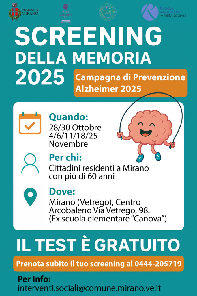 Il Comune di Mirano, attraverso i suoi Servizi Sociali, promuove la Campagna di Prevenzione Alzheimer 2025 con screening della memoria gratuiti rivolti ai cittadini con più di 60 anni.