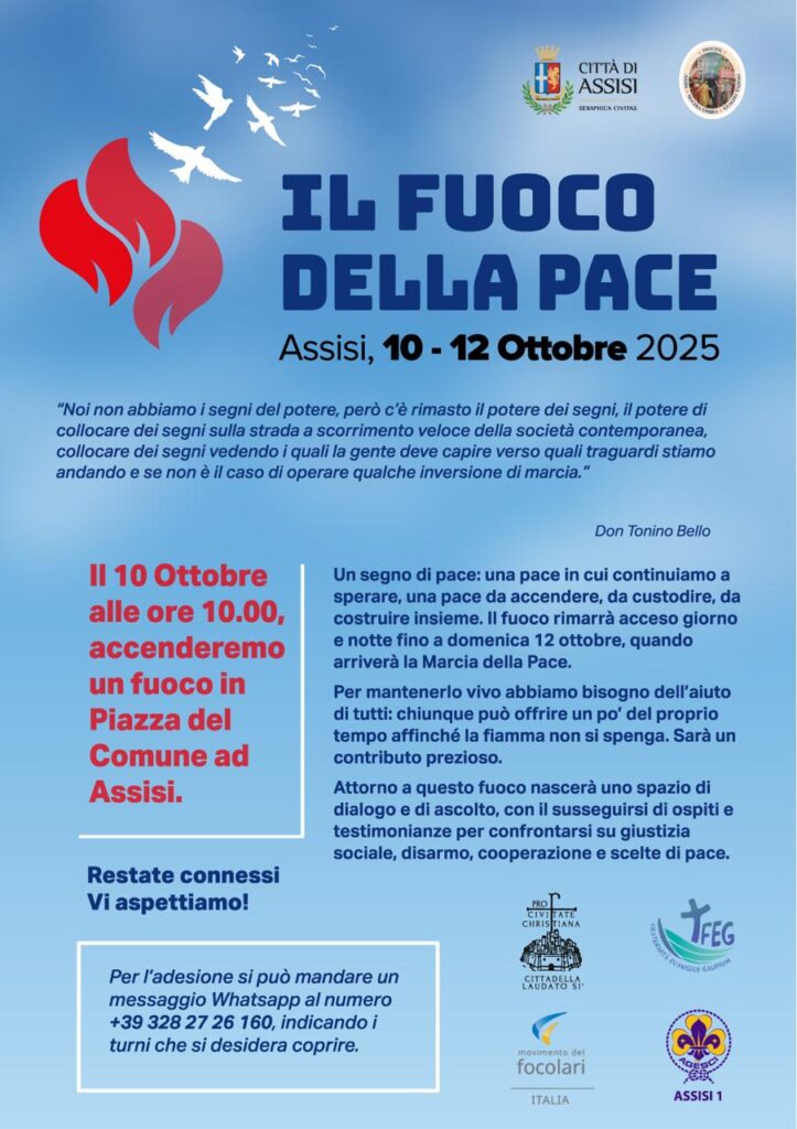 ASSISI – “Davanti al disagio che tante nostre sorelle e fratelli stanno vivendo a Gaza, in Ucraina, Congo, Sud Sudan, Myanmar, Haiti… il nostro impegno di presenza è come una goccia nel mare al punto che sembra di riascoltare come un monito nel nostro cuore il rimprovero di Gesù ai dodici: ‘Così non siete stati capaci di vegliare un’ora sola con me?’ (Mt. 26,40). Siamo chiamati pertanto a vegliare con ‘Cristo nostra pace’ (Ef. 2,14) affinché i cuori dei potenti si aprano al dono della pace e ciascuno di noi si converta sinceramente alla nonviolenza cristiana nei nostri comportamenti quotidiani, nelle scelte e nelle responsabilità come anche Papa Leone XIV ci ha più volte esortato”. Sono le parole del vescovo delle diocesi di Assisi – Nocera Umbra – Gualdo Tadino e Foligno, monsignor Domenico Sorrentino, per annunciare la partecipazione a “Il fuoco della pace”, in programma dal 10 al 12 ottobre in piazza del Comune ad Assisi. L’iniziativa – con il patrocinio del Comune di Assisi e della Diocesi di Assisi, Nocera Umbra, Gualdo Tadino e di Foligno – è promossa da Pro Civitate Christiana, Movimento dei Focolari, Fraternità Evangelii Gaudium e Agesci. Nello specifico in piazza del Comune verrà acceso un piccolo fuoco, alimentato 24 ore su 24, giorno e notte, attorno al quale sono previsti momenti di riflessione, testimonianze, condivisione e preghiera per invocare da Assisi la pace nel mondo. Chiunque può contribuire portando il proprio pezzo di legno da ardere e il proprio appello di pace. L’obiettivo è “rispondere al fuoco della guerra con il fuoco della pace”, accendendo la speranza.