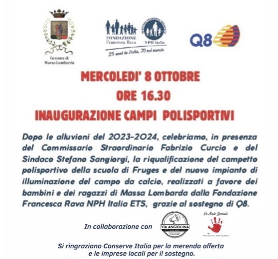 I colleghi della stampa sono invitati a partecipare all’inaugurazione dei nuovi campi polisportivi e dell’impianto di illuminazione del campo da calcio, realizzati a favore dei bambini e dei ragazzi di Massa Lombarda grazie al contributo straordinario de I Ragazzi di Via Angiolina, alla Fondazione Francesca Rava – NPH Italia ETS, con il sostegno di Q8 e la collaborazione del Comune di Massa Lombarda.