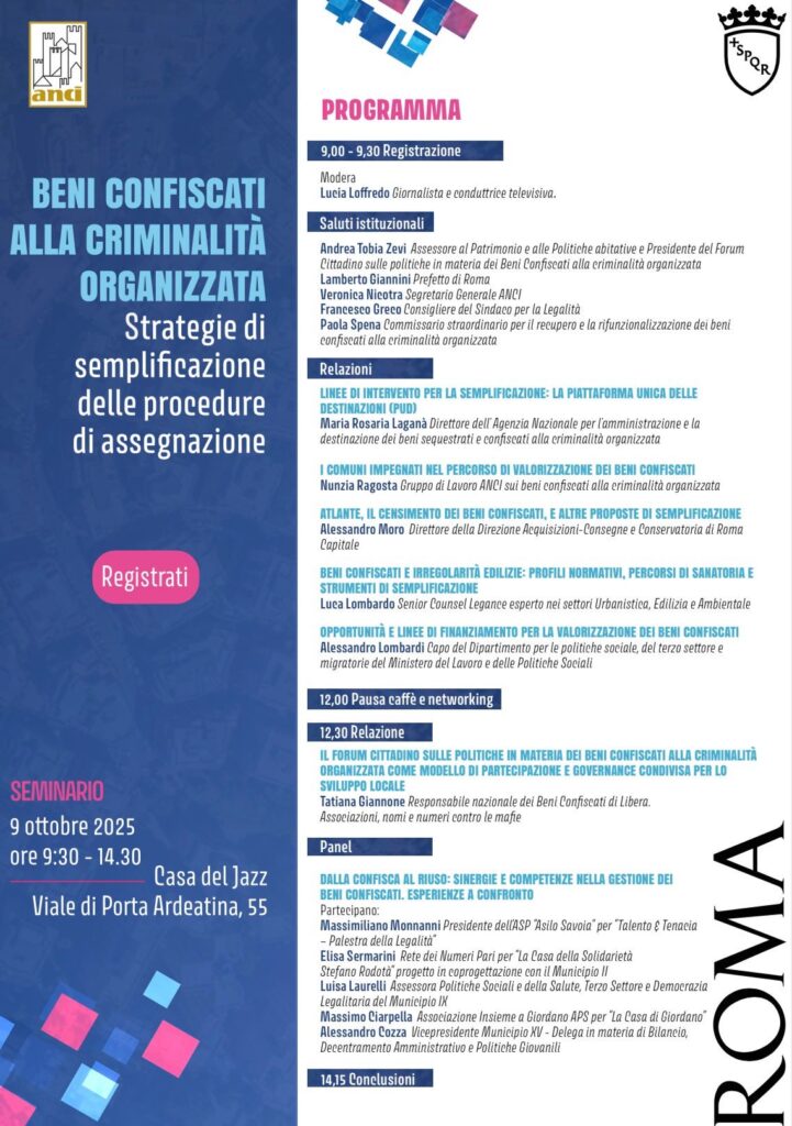 Roma Capitale, in collaborazione con ANCI, promuove un seminario dedicato al tema dei beni confiscati alla criminalità organizzata, con l’obiettivo di condividere strumenti e prospettive per la loro valorizzazione sociale. L’iniziativa riunisce rappresentanti istituzionali, esperti, enti del terzo settore e realtà territoriali impegnate nella gestione dei beni confiscati.