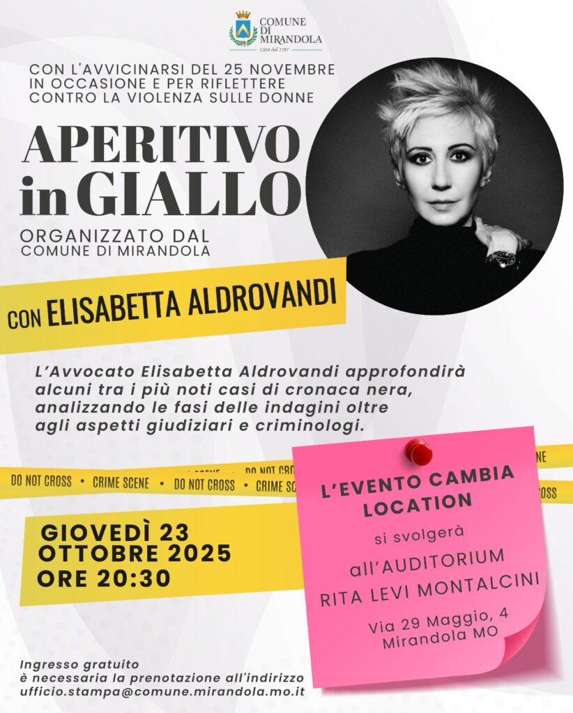 (AGENPARL) – Wed 08 October 2025 A meno di 24 ore dall’apertura delle prenotazioni, i posti disponibili nella Sala Consiliare del Municipio sono andati completamente esauriti. Un risultato che testimonia il forte interesse del pubblico per l’iniziativa “Aperitivo in Giallo”, promossa dal Comune di Mirandola e dedicata all’approfondimento di tematiche legate alla violenza di genere e alla cronaca nera.