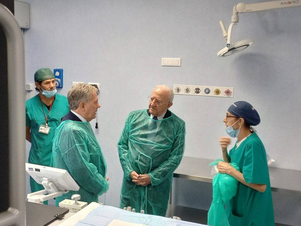 Napoli, 8 ottobre 2025 – L’Ospedale Cardarelli di Napoli è la prima struttura sanitaria pubblica italiana a dotarsi di una sala con “angiosuite” che potrà gestire sia l’emergenza che le attività in elezione. L’altra macchina dello stesso genere (un modello meno performante) è presente in Italia solo all’IEO di Milano – ospedale privato – ed è usata solo per le procedure in elezione. L’investimento per la nuova tecnologia del Cardarelli è stato di circa 3 milioni di euro ed è stato effettuato attingendo a fondi ministeriali per l’innovazione tecnologica in ambito sanitario.
