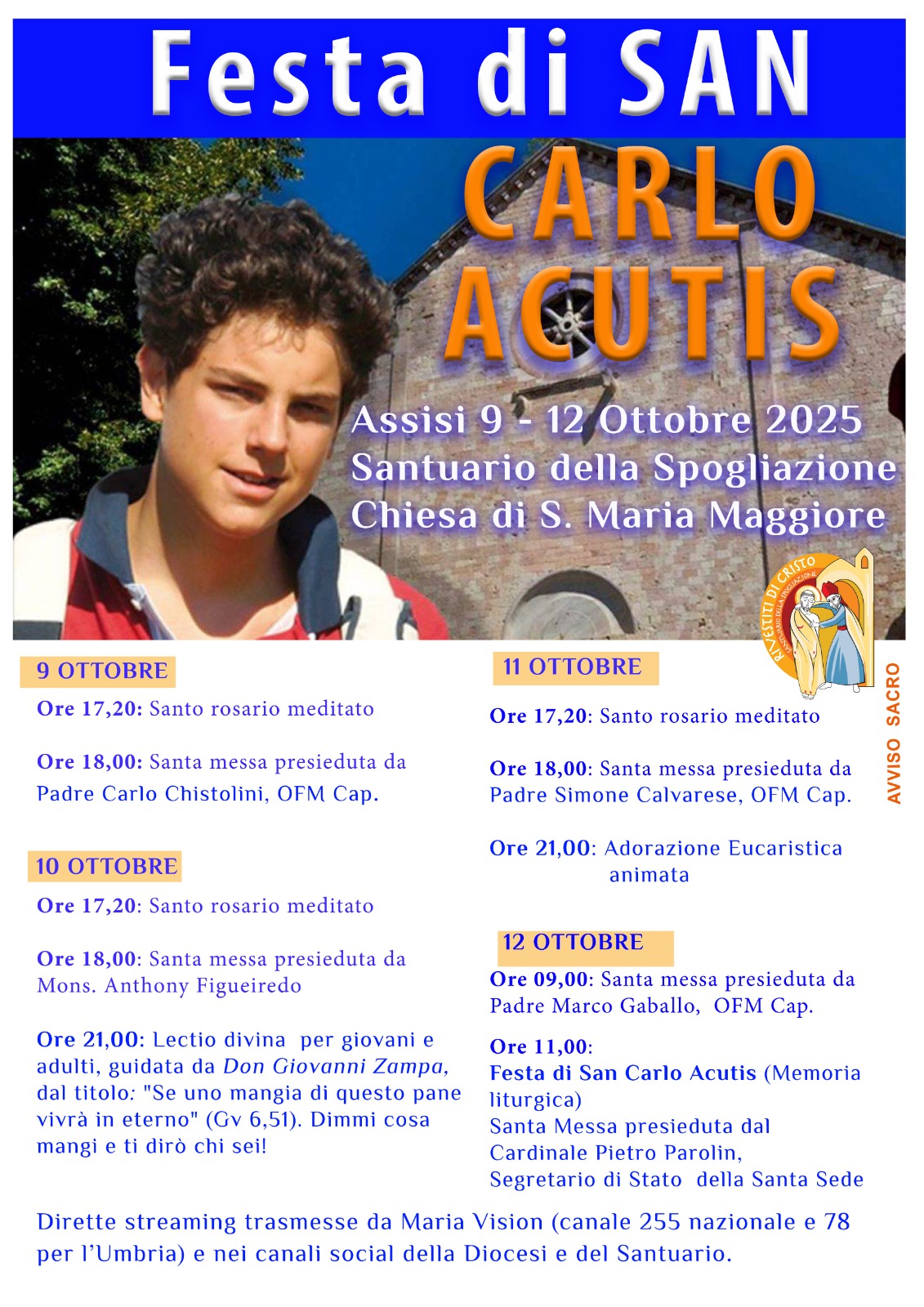 ASSISI – “Dopo il 4 ottobre, a distanza di otto giorni, ricordiamo e celebriamo San Carlo Acutis, questo giovane che insieme a San Francesco e Santa Chiara, è un’esplosione di gioia e di speranza per tante persone smarrite, in cerca di Dio. Siamo certi che questo team, in una città speciale come Assisi, possa portare frutti in termini di fraternità, pace, solidarietà e accoglienza”. A dirlo è il vescovo delle diocesi di Assisi – Nocera Umbra – Gualdo Tadino e di Foligno, monsignor Domenico Sorrentino, alla vigilia del triduo della festa di San Carlo Acutis che cade domenica 12 ottobre, giorno della sua memoria liturgica. Dal 9 al 12 ottobre, nella chiesa di Santa Maria Maggiore – Santuario della Spogliazione sono previsti diversi momenti per celebrare la prima festa di San Carlo. Si parte giovedì 9 ottobre alle 18 con la santa messa presieduta da padre Carlo Chistolini, vice presidente della Fondazione diocesana Santuario della Spogliazione; il 10 ottobre a presiedere la celebrazione delle 18 sarà monsignor Anthony Figueiredo, responsabile delle Relazioni internazionali della diocesi, mentre in serata alle 21 si terrà la lectio divina per giovani e adulti sul tema “Se uno mangia di questo pane vivrà in eterno”, tenuta dal vicario generale, don Giovanni Zampa. L’11 ottobre la messa delle 18 sarà presieduta da padre Simone Calvarese, ministro provinciale dei cappuccini d’Abruzzo, Lazio e Umbria, mentre il 12 ottobre alle ore 9, santa messa celebrata dal rettore del Santuario padre Marco Gaballo. Alle ore 11 sarà il cardinale Pietro Parolin, segretario di Stato della Santa Sede, a presiedere la celebrazione eucaristica in occasione della memoria liturgica di San Carlo Acutis. Tutti i giorni alle 17,20, prima delle celebrazioni, è previsto il santo rosario meditato. I vari momenti saranno trasmessi in diretta da Maria Vision (canale 255 nazionale e 78 per l’Umbria) e sui canali social della diocesi e del Santuario della Spogliazione.