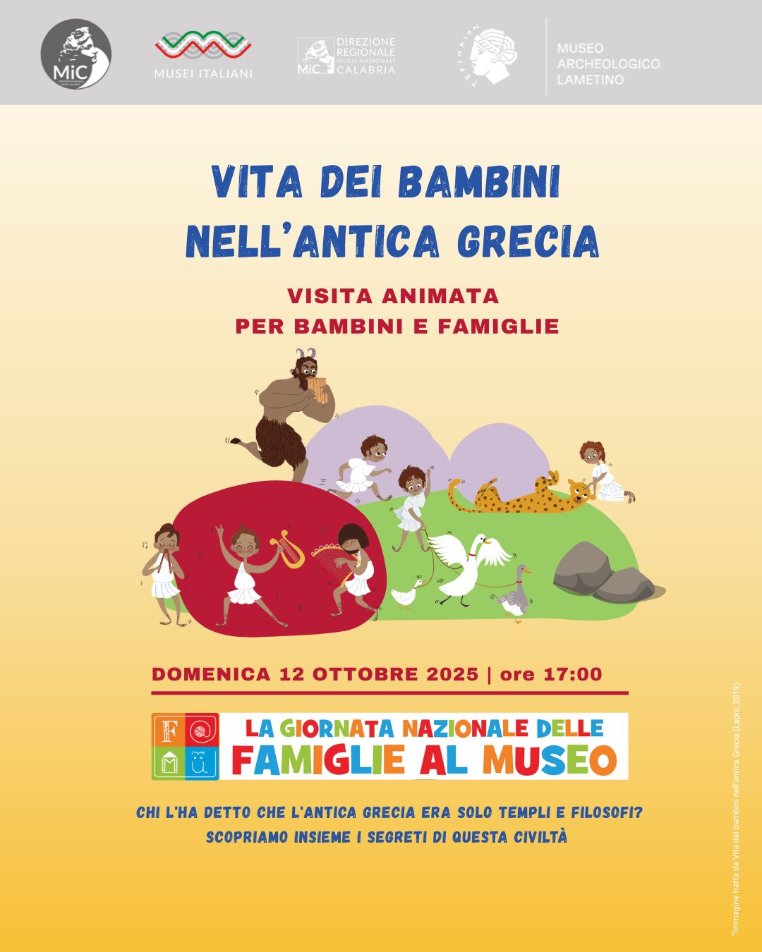 Domenica 12 ottobre (alle ore 17.00) per la Giornata Nazionale delle Famiglie al Museo 2025 il Museo Archeologico Lametino ospita una visita animata per famiglie e bambini dal titolo “Vita dei bambini nell’Antica Grecia”.