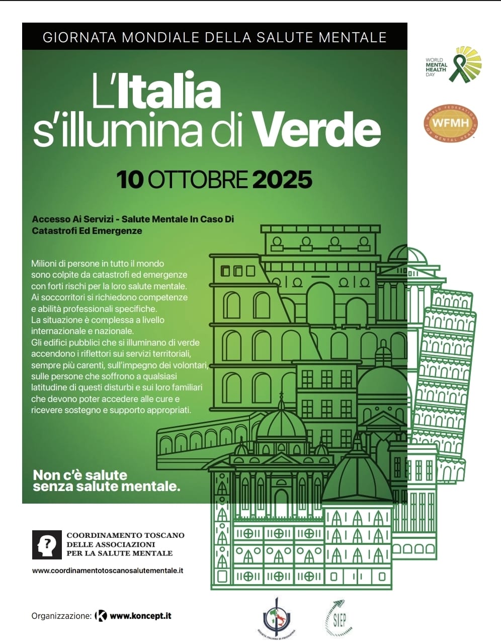 Stasera il municipio di Montemurlo e piazza della Libertà s’illuminano di verde per la Giornata Mondiale della Salute Mentale, istituita nel 1992 per iniziativa di Richard Hunter, vice segretario generale della Federazione Mondiale per la Salute Mentale e promossa dall’Organizzazione Mondiale della Sanità attraverso iniziative che accrescono la consapevolezza dell’importanza della salute mentale come parte integrante del concetto di salute pubblica e di benessere di una comunità. Ogni anno la Giornata Mondiale della Salute Mentale ha un proprio tema di riferimento. Il tema scelto per l’edizione 2025 è “Accesso ai Servizi – Salute Mentale nelle Catastrofi e nelle Emergenze”. L’attuale scenario mondiale fatto di guerre, crisi umanitarie e instabilità geopolitica produce non solo devastazioni materiali ma anche il logoramento e annichilimento della psiche umana. Chi sopravvive è spesso condannato ad una vita spezzata, relegato in un’esistenza traumatica, ed è per questo che è fondamentale garantire un sostegno psicologico, creare una rete di supporto fatta di operatori qualificati e spazi sicuri, dando voce a chi ha perso tutto ma cerca ancora dignità e speranza. La Giornata Mondiale della Salute Mentale è anche un’opportunità per combattere il pregiudizio e la censura sociale che gravano ancora sul tema della salute mentale. Prendersi cura della propria salute mentale è un diritto, è parte integrante del concetto di qualità della vita, non deve essere un tabù. Solo abbattendo lo stigma è possibile costruire una comunità più empatica, in cui ogni individuo possa manifestare il proprio bisogno di cura senza paura di essere emarginato.