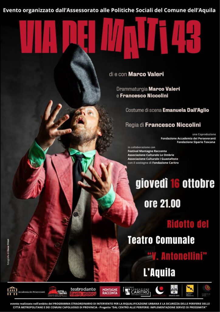 Nell’ambito del progetto “Dal Centro alle Periferie” e delle attività promosse dall’Assessorato alle Politiche Sociali del Comune dell’Aquila, giovedì 16 ottobre 2025, alle ore 21.00, presso il Ridotto del Teatro Comunale “V. Antonellini”, andrà in scena lo spettacolo teatrale “Via dei Matti 43”, scritto e interpretato da Marco Valeri con la regia di Francesco Niccolini. L’ingresso è completamente gratuito.