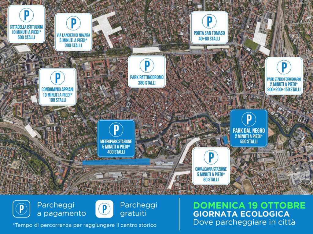 Le modifiche alla viabilità riguarderanno la zona Dentro Mura, dove sarà interdetta la circolazione alle auto dalle ore 9 alle ore 18. Per rendere agevole l’accesso ai visitatori verranno predisposti appositi cartelli e indicazioni con i parcheggi consigliati sui pannelli a messaggio variabile installati lungo le principali vie d’accesso alla città. Le aree consigliate per la sosta sono la Cittadella delle Istituzioni (10 minuti a piedi dal centro), via Lancieri di Novara (5 minuti), al Park Pattinodromo (2 minuti), lungo le Mura a Porta S. Tomaso (2 minuti), al Park Foro Boario (8 minuti), al Park Dal Negro (2 minuti), cavalcavia della stazione (5 minuti), al Metropark Stazione (5 minuti) e al Condominio Appiani (10 minuti).