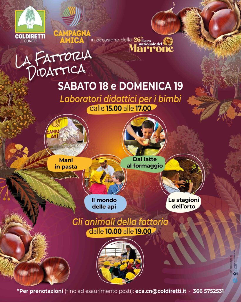 “Anche quest’anno rinnoviamo con entusiasmo la nostra presenza alla Fiera nazionale del Marrone, dedicando uno spazio speciale ai più piccoli per farli diventare protagonisti della scuola di campagna – dichiara Enrico Nada, Presidente di Coldiretti Cuneo –. È un’occasione preziosa per trasmettere valori fondamentali come la stagionalità, la qualità e la genuinità dei prodotti del nostro territorio”.