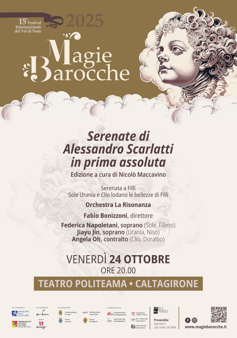 Com. “Magie Barocche”, 15° Festival internazionale del Val di Noto: al Politeama di Caltagirone, venerdì 24 ottobre, le Serenate di Alessandro Scarlatti in prima assoluta. La mattina, a Palazzo Libertini di San Marco, Giornata di studio