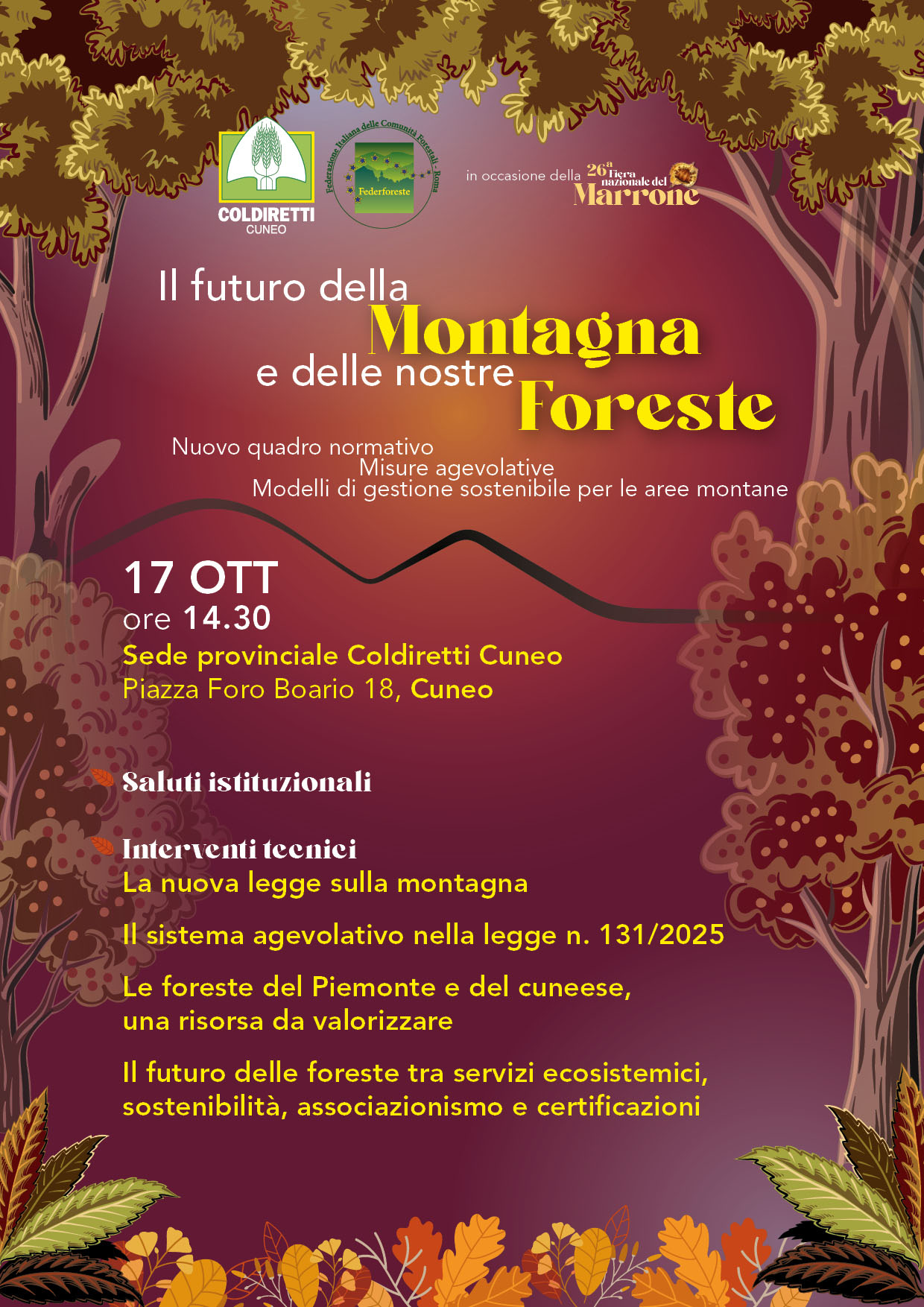 In questo contesto di rinnovata attenzione verso la montagna, venerdì 17 ottobre, nell’ambito della 26ª edizione della Fiera nazionale del Marrone, la sede provinciale di Coldiretti Cuneo ospiterà il convegno “Il futuro della montagna e delle nostre foreste”, organizzato in collaborazione con Federforeste.
