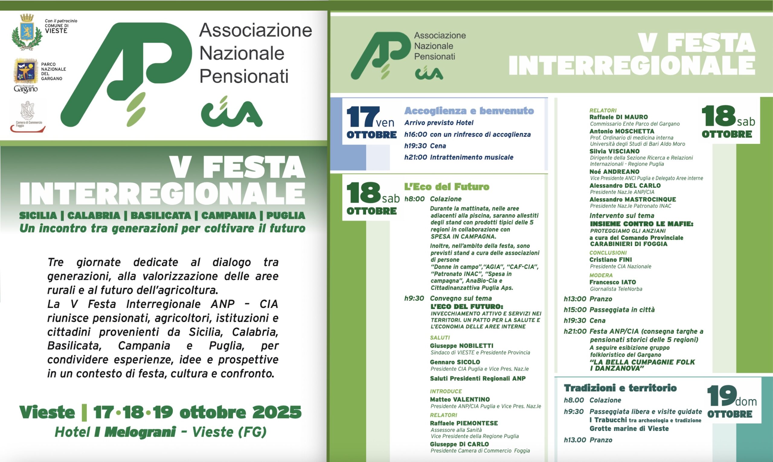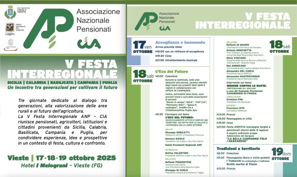 Tre giornate, cinque regioni rappresentate, 600 delegati provenienti da Sicilia, Calabria, Basilicata, Campania e da ciascuna delle 6 province della Puglia: sono questi i numeri della quinta “Festa Interregionale dell’ANP-CIA”, l’Associazione Nazionale dei Pensionati di CIA Agricoltori Italiani.