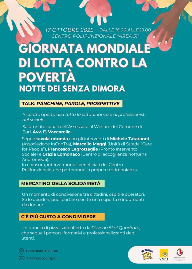 Il 17 ottobre ricorre la Giornata internazionale contro la povertà, istituita dall’ONU nel 1992. Per l’occasione, domani il Centro Polifunzionale “Area 51” di Bari (corso Italia 83) apre le sue porte alla cittadinanza con un pomeriggio di dialogo, solidarietà e condivisione. L’iniziativa, intitolata “Notte dei Senza Dimora”, si svolgerà dalle 16 alle 19, in collaborazione con l’associazione di volontariato In.Con.Tra., e rappresenta un momento di riflessione e partecipazione attiva sui temi dell’esclusione sociale e della povertà, coinvolgendo istituzioni, operatori e cittadini.