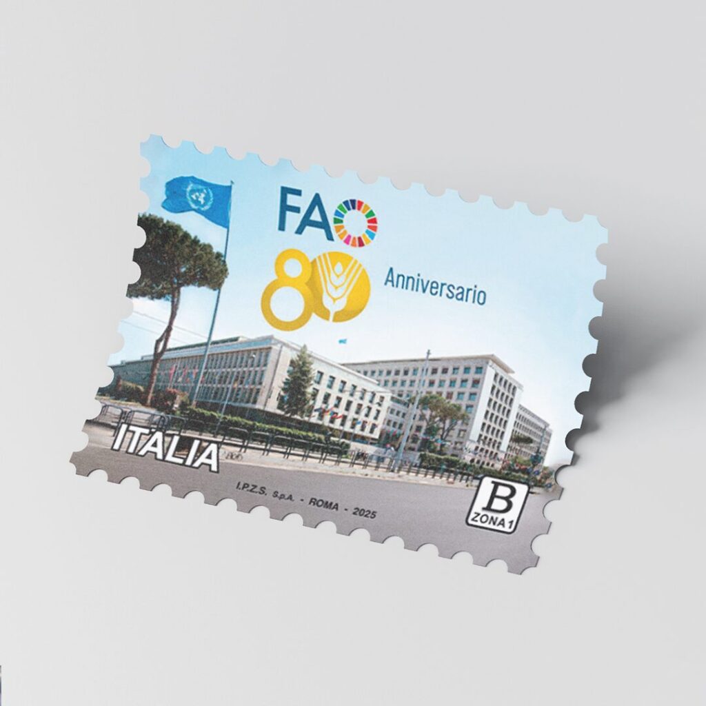Il francobollo, emesso nell’ambito della serie italiana “Valori Sociali” – che celebra istituzioni e iniziative che contribuiscono al bene comune – celebra gli otto decenni di lavoro della FAO per garantire la sicurezza alimentare per tutti. Progettato dalla FAO e ottimizzato dal Centro Filatelico IPZS, presenta il logo dell’80° anniversario della FAO che simboleggia gli Obiettivi di Sviluppo Sostenibile, l’emblema istituzionale dell’Organizzazione e il suo motto “Fiat Panis”, rappresentato da una spiga di grano stilizzata che forma il numero 80. Sullo sfondo, è raffigurata la sede storica della FAO nel quartiere Aventino di Roma, con la bandiera delle Nazioni Unite che sventola sopra.